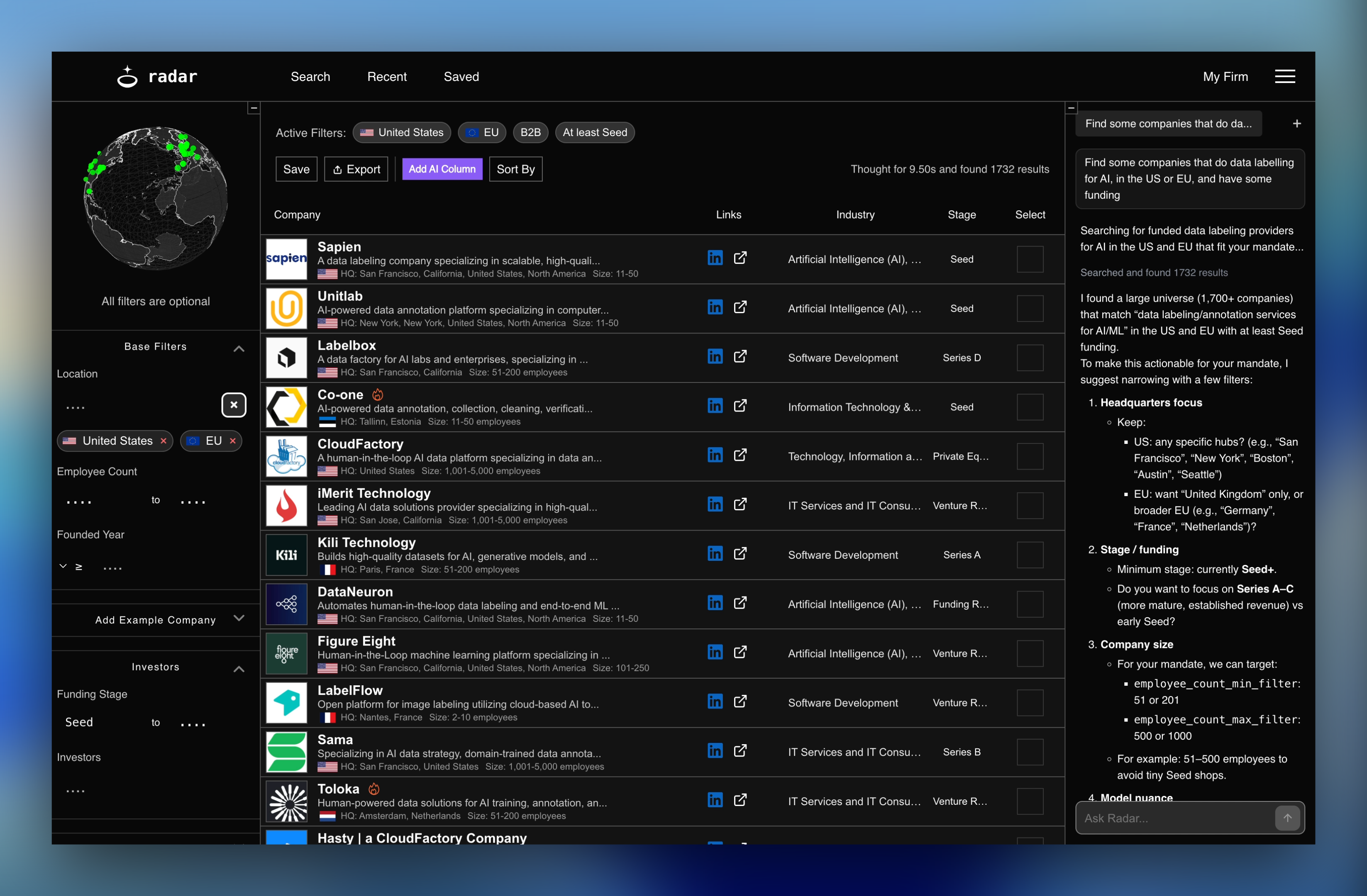 Radar is an AI that has access to private market data on millions of companies, as well as powerful search functionality.